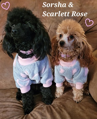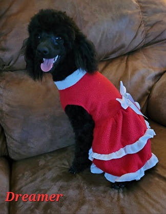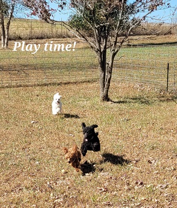 Why do I love toy Poodles? NO SHEDDING to start with! I LOVE that they can lay on me for hours without me being covered in hair. I don’t have to wash sheets every day, sweep the kitchen floor or vacuum the couch! While I will always love Chihuahuas they shed so bad, especially when they get older. So when I lost my last Chihuahua I went with a Poodle. My mother always had a Poodle now I know why. They are so smart and easily trained to do tricks, walk on a leash and potty train. They LOVE attention, treats, squeaky toys, are super lap dogs and very cuddly at sleep time, so yeah, your bed. They don’t mind being dressed up. After being groomed they like having a sweater when it’s cold.  Be prepared for lots of kisses with Poodles as they are very affectionate. On top of all that they are BEAUTIFUL little dogs! They do require regular grooming to keep them that way. They need regular exercise as they do have energy that needs to be released. They can be wary of strangers, especially when in their home environment, protect mode. Once they realize a visitor is not a threat they are ok and will visit with them. I take mine to the feed store, Walmart and other places that won’t kick us out. They do need to be taught to ride in the car as much as possible so they get used to it. Mine have a very nice carseat, which I do recommend having! They are a small dog so can have hypoglycemia as pups and need to be monitored. I don’t let my pups go until they are a little older so they can handle the stress a bit more. My Poodles are AKC Registered! As you can see I tend to favor the black Poodles. They can ware any color, hot pink, neon green, red, purple, you name it and it will look good on them.